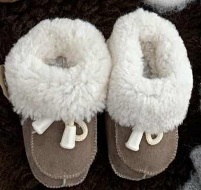 Viking fårskinnstoffel för barn (egen tillverkning TK Hantverk) med en mjuk soft sula som gör det mysigt att krypa upp i soffan. Finns i färgerna beige och grå och dubbelstorlekar 22-23 tom 34-35.
